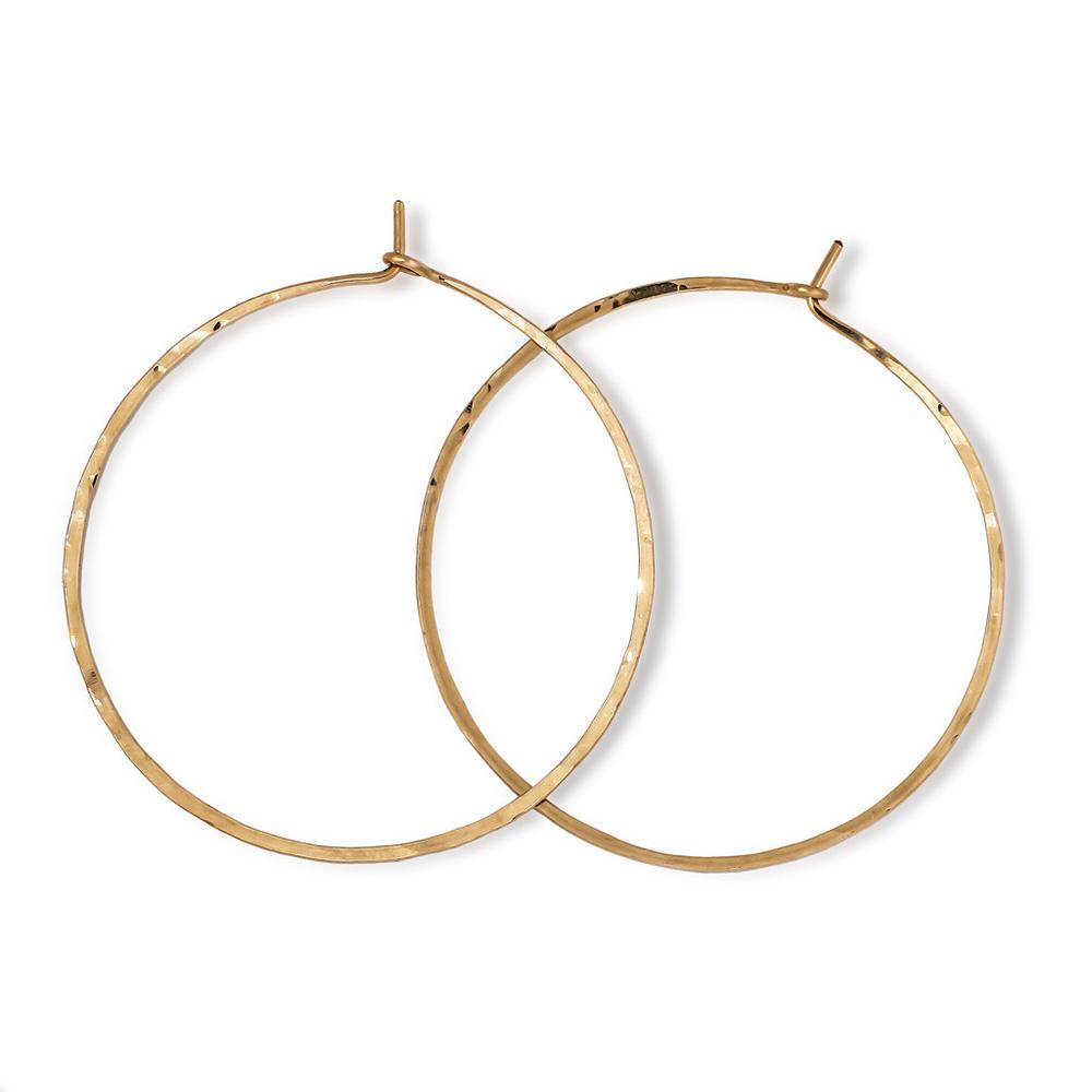 Go To Everyday Hoops! These delicate 3" hoops are hand crafted hand shaped, filed, forged and polished to a glittering finish. Available argentium sterling silver, 14k gold fill, rose gold fill or brass and copper. They measure 3" in diameter, are lightweight and close with a loop in the back. The high quality metals (sterling, gold, or rose gold)  will never turn no matter how much you wear them.