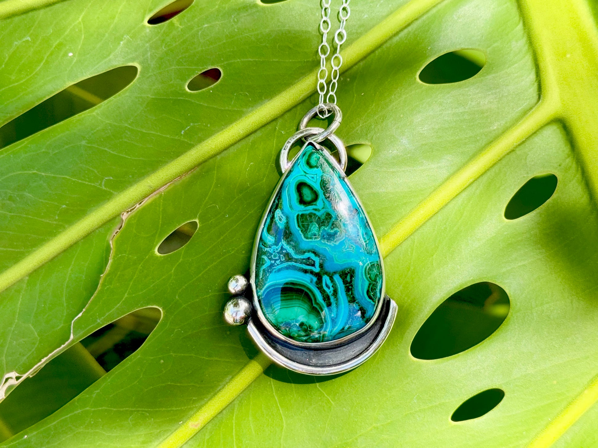 A dance of earth and water, this teardrop chrysocolla-malachite is a breathtaking blend of vibrant turquoise blues and lush malachite greens, wrapped in sleek sterling silver.