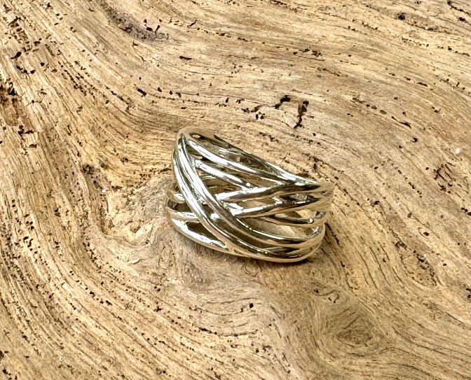 This stunning sterling silver ring features six bands intertwined to create a unique accent piece. Handmade with care, it can stand alone or be stacked with other rings for a customizable look.
